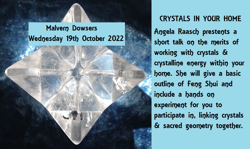 Angela has been invited to give a short talk on the benefits of using crystals and crystalline energy within your home, this coming October, by Malvern Dowsers. on the 19th October 2022, on the occasion of their AGM